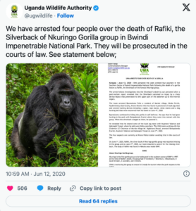 In June 2020, one of Uganda’s best-known mountain gorillas was killed by a poacher. Rafiki, a 25-year-old large silverback who led a group of 17 gorillas, was speared to death by a poacher who had set traps to catch bush meat.